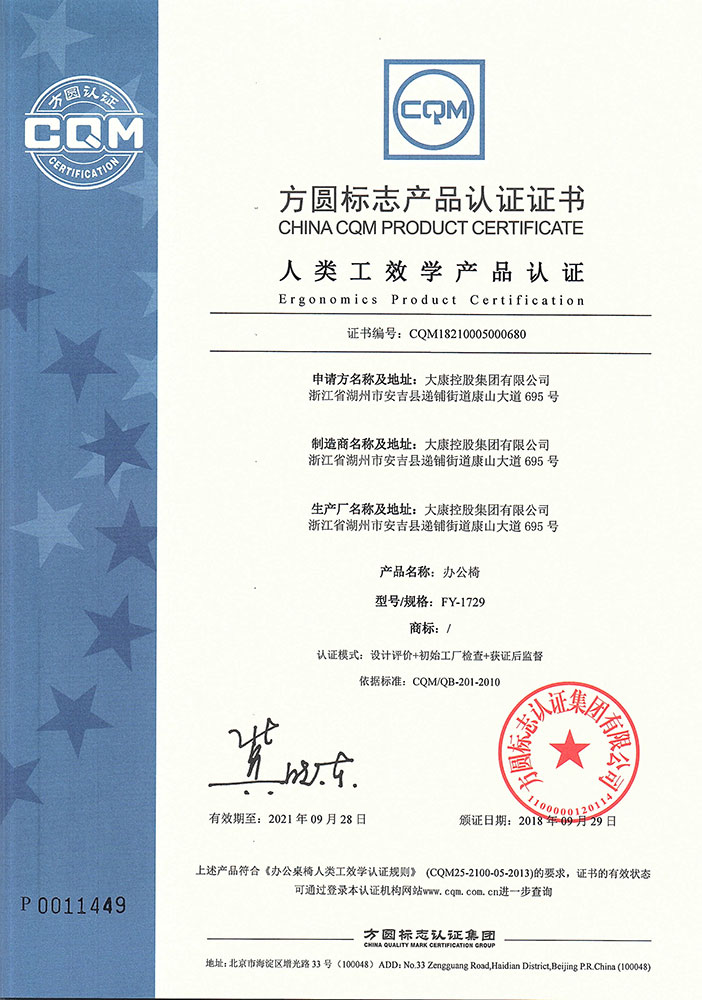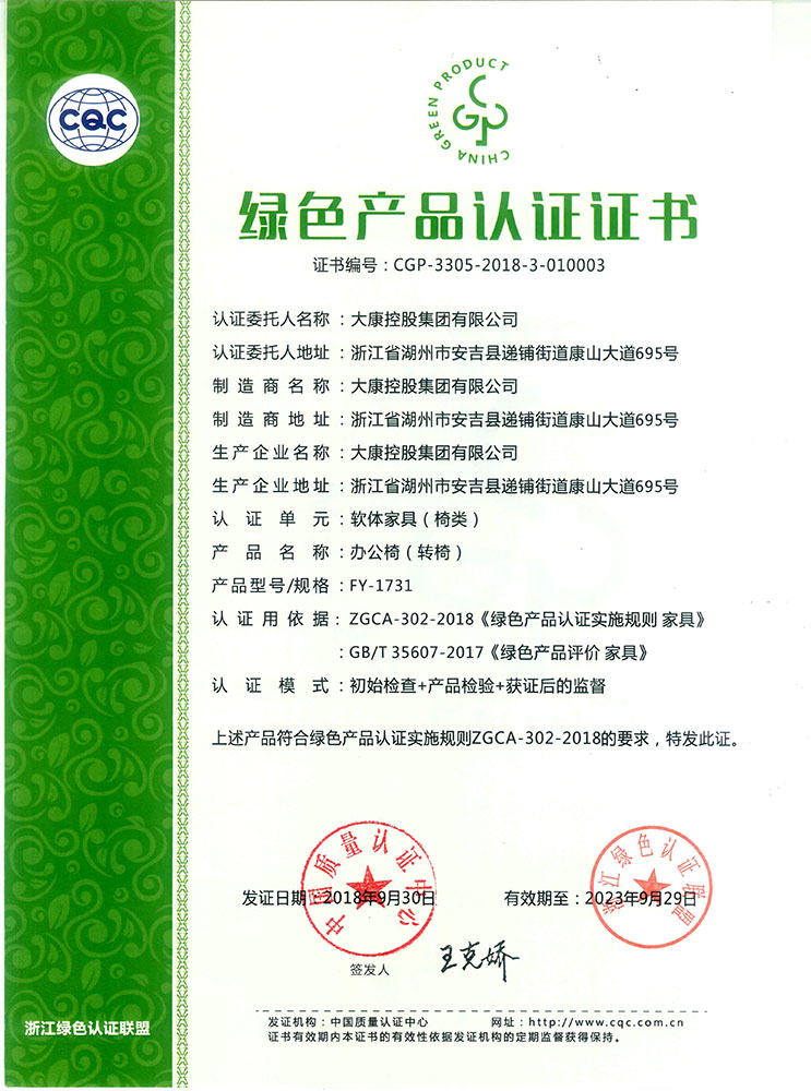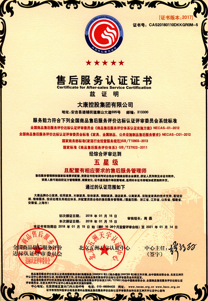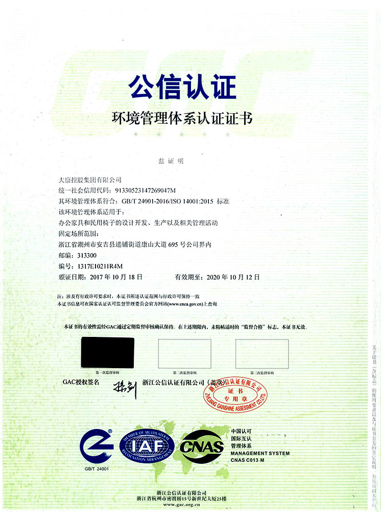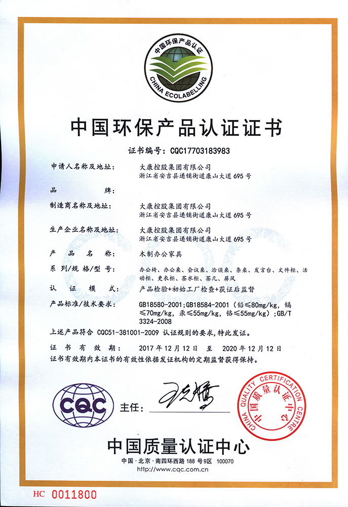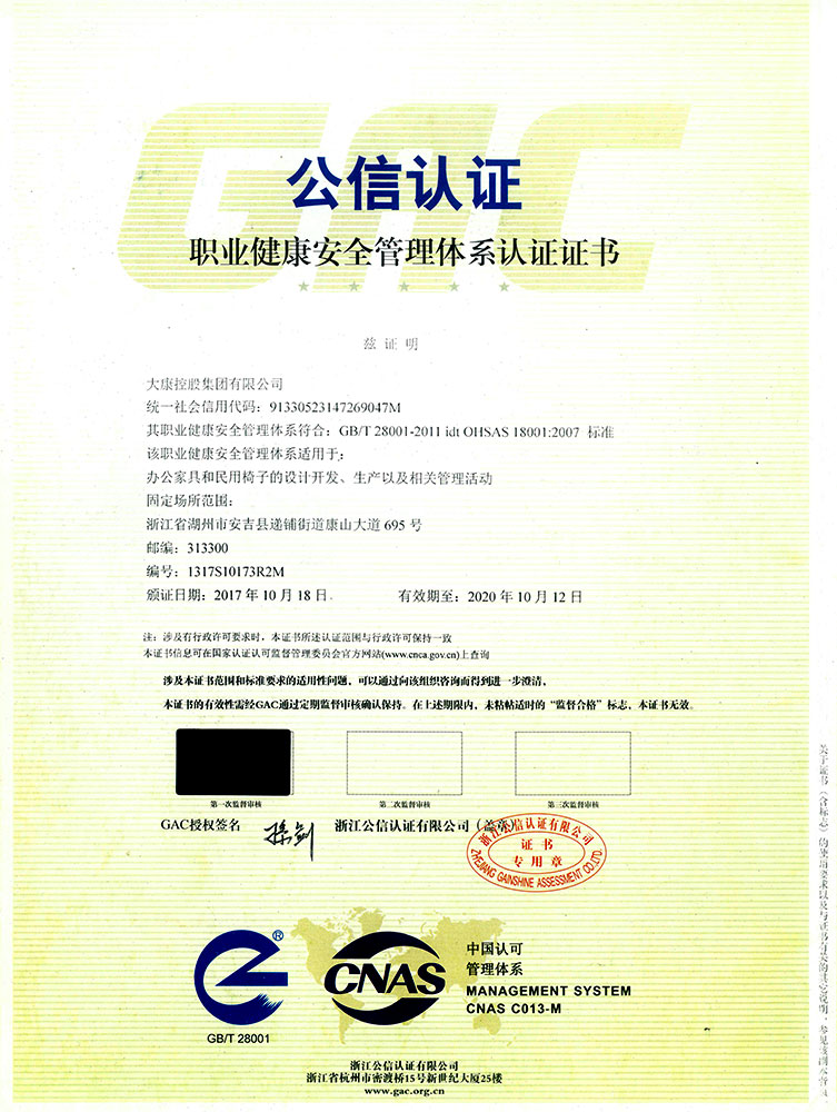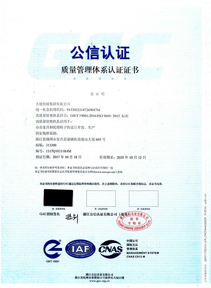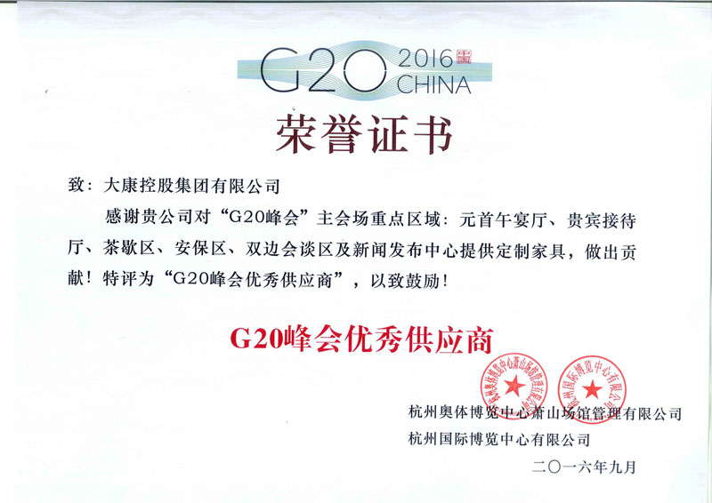 想的是盡善盡美,做的是精益求精。大康管理層一直視質(zhì)量為生命,以信譽贏市場,從產(chǎn)品的設計到原材料的選定、生產(chǎn)過程中的質(zhì)量管理、質(zhì)量監(jiān)督,一直秉持健康環(huán)保的理念,真正做到一絲不茍。順利通過ISO9001國際質(zhì)量體系認證、ISO14001:2004國際環(huán)境管理體系認證和OHSAS18001:1999職業(yè)健康安全管理體系認證證書。公司連續(xù)13年被浙江省家具協(xié)會評為省級先進企業(yè)。家具、轉(zhuǎn)椅系列的優(yōu)良質(zhì)量和信譽使公司的產(chǎn)品銷售收入和利潤也因此得以逐年遞增。2016年公司以精湛的工藝、優(yōu)質(zhì)的產(chǎn)品質(zhì)量、積極的服務態(tài)度和家喻戶曉的品牌成為杭州G20峰會的主要家具供應商,產(chǎn)品實現(xiàn)了杭州G20峰會主副會場全覆蓋。公司繼G20之后再次取得2017年“廈門金磚五國會晤”和2018年青島上合組織峰會的家具制作任務,為各國元首定制元首椅。